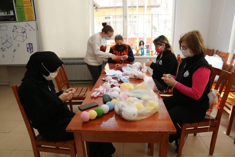 Burhaniye Belediye personeli, kreş çocukları için gönüllü olarak Amigurumi oyuncak yapıyor.