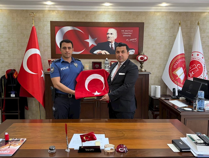 Başsavcı Çatlı, Emniyet Müdürü Umar'a günün anısına Türk bayrağı hediye etti.