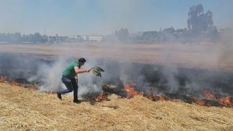 Anız yangınına ilk müdahaleyi ağaç dallarıyla yaptılar