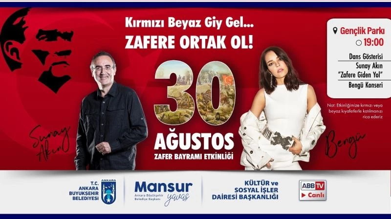 Başkentlilerden 30 Ağustos Zafer Bayramı konserine “Kırmızı Beyaz Giy Gel. Zafere Ortak Ol” çağrısıyla kırmızı beyaz kıyafet giyerek katılmalarını isteyen Ankara Büyükşehir Belediyesi, kutlama programında dans gösterisiyle de Başkentlilere unutulmaz bir zafer bayramı yaşatacak. Sunay Akın ve Bengü’nün sahne alacağı konser ile birlikte hafta boyunca sürecek ücretsiz açık hava konser programlarına tüm vatandaşları sosyal medya hesaplarından yaptığı duyuru ile davet eden Büyükşehir Belediye Başkanı Mansur Yavaş da, “Hafta boyunca Başkent’in dört bir yanında düzenleyeceğimiz konserler ile 30 Ağustos Zafer Bayramımızın sevincini gelin birlikte yaşayalım. Tüm hemşehrilerimizi bekliyoruz” dedi.