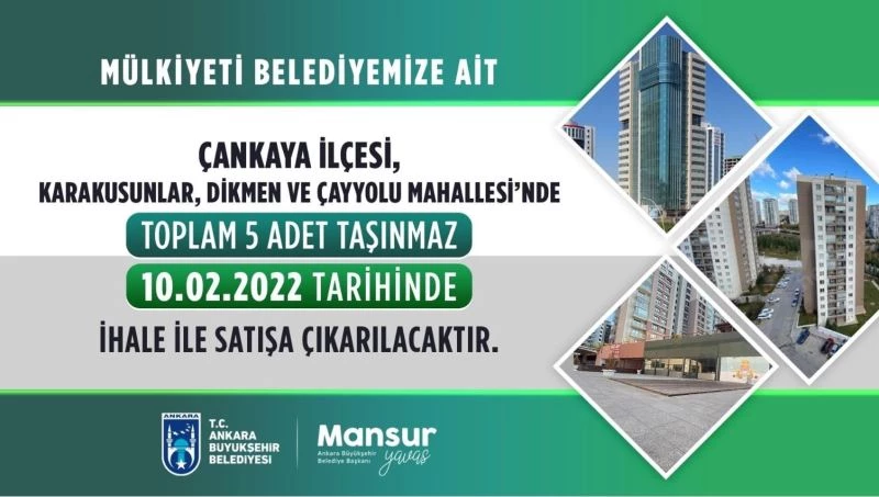 Ankara Büyükşehir Belediyesi Emlak ve İstimlak Daire Başkanlığı, Çankaya ilçesi Karakusunlar, Dikmen ve Çayyolu’nda bulunan konut ve dükkandan oluşan toplam 16 taşınmazı 3 ve 10 Şubat tarihlerinde gerçekleştirilecek ihalelerle satışa çıkartıyor.