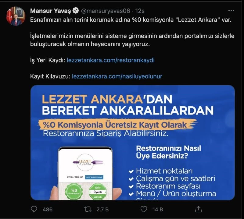 Başkan Yavaş, lokanta, kafe ve restoranların portala üye olmak için nasıl kayıt yaptıracaklarını gösteren iş yeri kaydı ve kayıt kılavuzuna ilişkin linkleri de paylaştı. İşletmelerin hiçbir ücret ödemeden yaptıracakları kayıtların ardından Lezzet Ankara’nın aktifleştirilerek Başkentlilerin kullanımına sunulacağını ifade eden Yavaş, ekonomik yönden destek sağlayacak uygulama sayesinde esnafın komisyon ödemeden sipariş alabileceğini duyurdu.