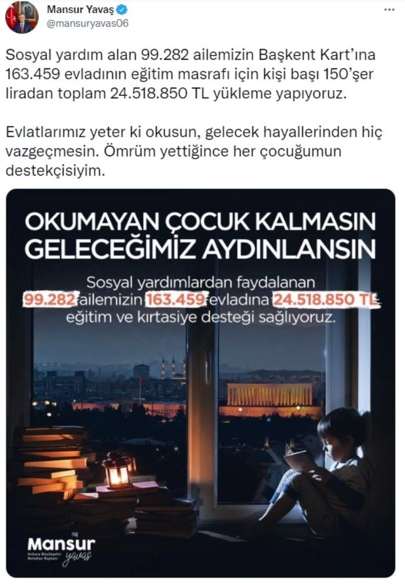 “Sosyal yardım alan 99 bin 282 ailemizin Başkent Kartı’na 163 bin 459 evladının eğitim masrafı için kişi başı 150’şer liradan toplam 24 milyon 518 bin 850 TL yükleme yapıyoruz. Evlatlarımız yeter ki okusun, gelecek hayallerinden hiç vazgeçmesin. Ömrüm yettiğince her çocuğumun destekçisiyim.”