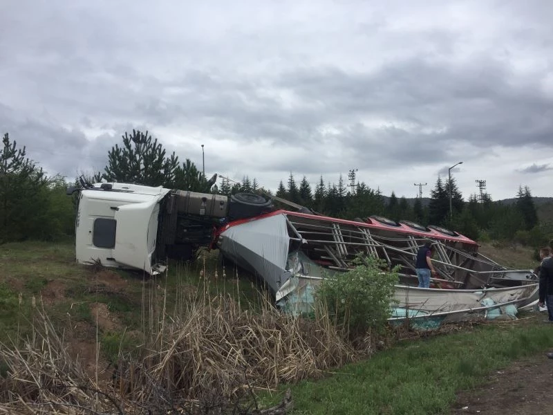 Ankara-İstanbul otobanında tırın devrildiği trafik kazasında, sürücü yaralandı.
