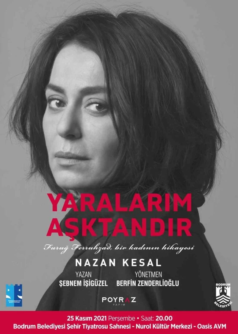 Nazan Kesal “Yaralarım Aşktandır” adlı tek kişilik oyunu 25 Kasım 2021 Perşembe günü saat 20.30’da Oasis Nurol Kültür Merkezi Bodrum Belediyesi Şehir Tiyatrosu Sahnesi’nde ücretsiz olarak gösterilecek. “Yaralarım Aşktandır” adlı tek kişilik oyunuyla, Nazan Kesal, İran’ın güçlü kadın şairi Furuğ Ferruhzad’ı oynuyor. Yazar Şebnem İşigüzel’in kaleme aldığı ve Berfin Zenderlioğlu’nun yönettiği oyun, İran şiirinin isyankar sesi Füruğ Ferruhzad’ın nefesini, tiyatro sahnesine taşıyor.