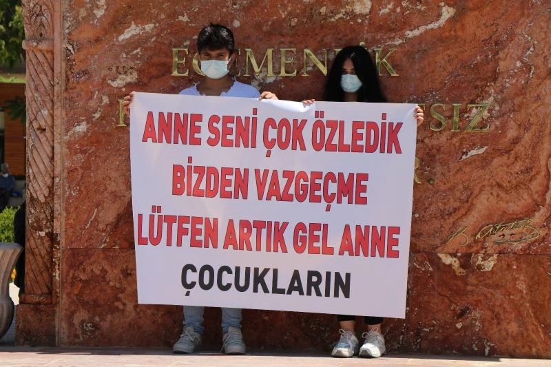Çevrede bulunanlar ise iki kardeşin pankartlı annelerine sesleniş çağrılarını meraklı gözlerle izledi.