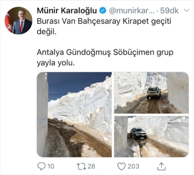 Bu arada Antalya Valisi Karaloglu, Toros Daglari'nin zirvelerinde yer yer yüksekligi 5 ila 10 metreyi bulan kar birikintisi arasinda açilan yayla yollarinin fotograflariyla sosyal medya hesabindan yaptigi paylasimda, "Burasi Van Bahçesaray Kirapet geçidi degil, Antalya Gündogmus Söbüçimen grup yayla yolu." ifadesini kullandi.
