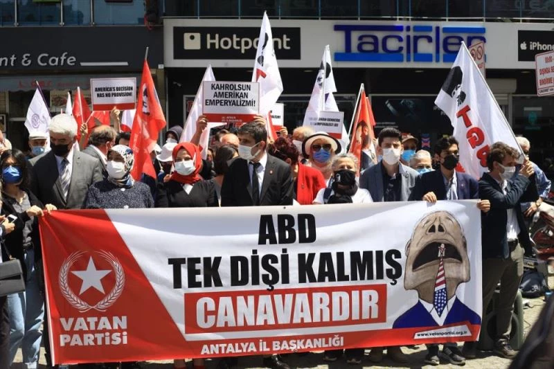 Muratpaşa ilçesinde Kapalıyol olarak bilinen Kazım Özalp Caddesi'nde, Vatan Partisi ile 20'ye yakın sivil toplum kuruluşu üyesi, ellerinde Türk bayraklarıyla sloganlar atarak, ABD Başkanı Biden'a tepki gösterdi.