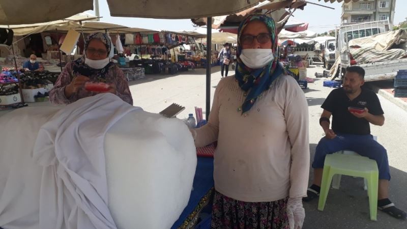 Serik’te hava sıcaklığının 41 dereceye ulaşmasıyla birlikte dağlardan getirilen kar için büyük emek verdiklerini belirten karlama satıcısı Emine Salman, "Bu karlama işine 2010 yılından beri devam ediyoruz. Gündoğmuş yaylasından getiriyoruz, Eğri Göl’den. Bu o kadar zor ki o dağları görseniz, bu kar nasıl çıkar dersiniz. O kadar emek sarf ediyoruz. Milleti memnun etmek için, serinletmek için. Yazın mükemmel bir lezzet bu. Özellikle yaz aylarında Haziran’da başlıyoruz. Ekim ayına kadar devam ediyoruz. Özellikle bu lezzeti en çok sıcakta kalanlar, Yörükler ve çocuklar tercih ediyor" şeklinde konuştu.
