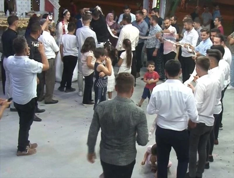 Damadın arkadaşlarının düğünde 5 liraları uç uca ekleyerek Tanrıkulu'nun yakasına takması renkli ve eğlenceli görüntüler oluşturdu.