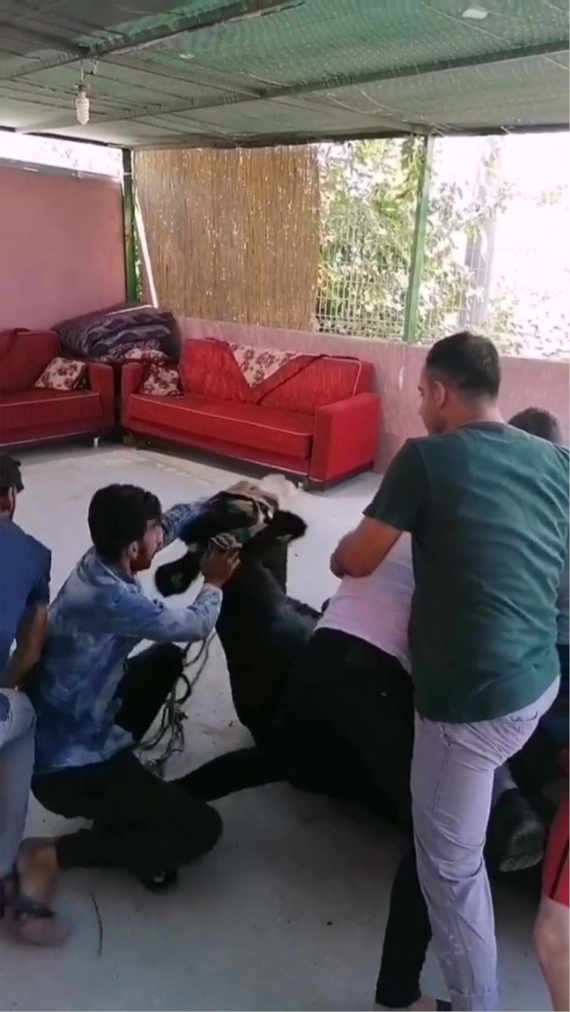 En ilginç bir görüntü ise Aksu ilçesinde yaşandı. 6 kişi danayı kesmek için yere yatırdı. İki kişi, danayı boynundan kesmek için kafasını tam yere yatırmak istedi. Dana kafasını sert bir şekilde sallayınca bir kişi beton zemine savruldu. Diğer kişiler danayı zapt etmek istese de başarılı olamadı. 6 kişinin danayı kesme çabası renkli görüntüler oluşturdu.