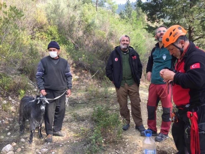 Kısa sürede bölgeye gelen ekipler, keçinin bulunduğu kayalıklara tırmandı. Keçi, halat yardımıyla güvenli alana indirildi.