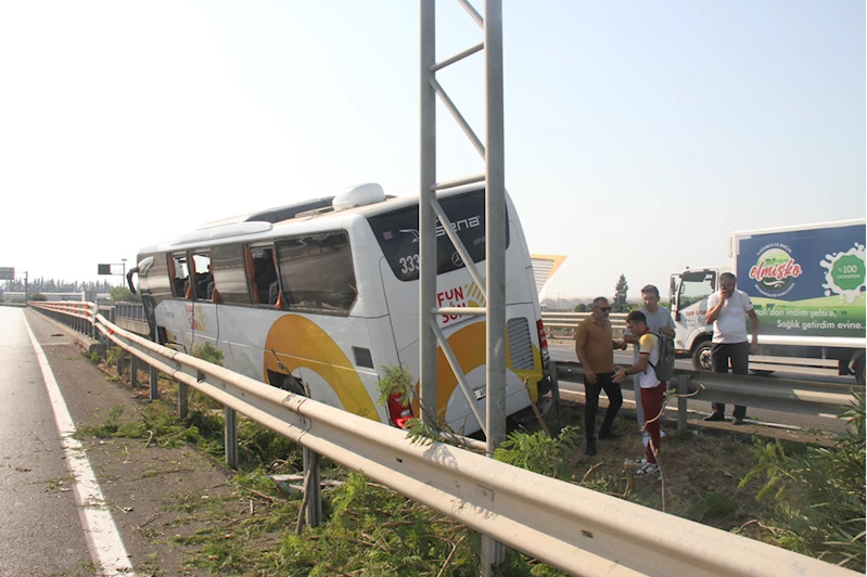 ANTALYA - Antalya'nın Serik ilçesinde refüje giren tur otobüsü köprü korkulukları arasında kaldı.