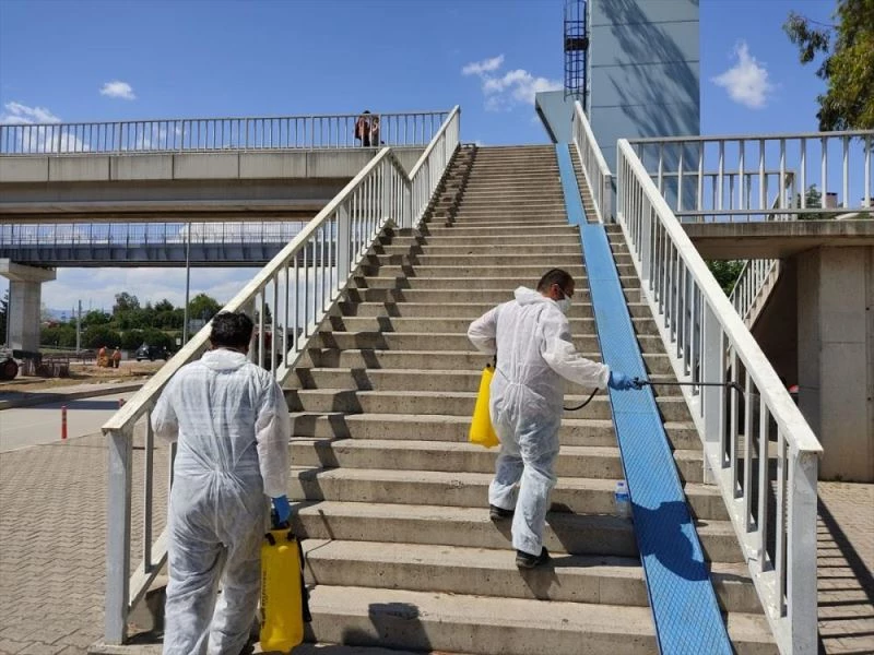 Kent merkezinde bulunan yürüyen merdivenli üst geçitler ve asansörleri de dezenfekte eden ekipler, vatandaslari maske kullanimi ve sosyal mesafeye dikkat etmeleri konusunda uyardi.