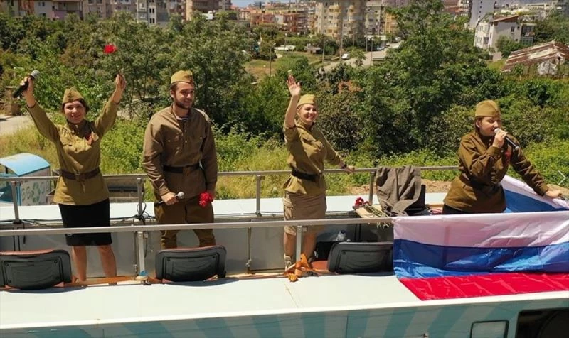 Kutlamalar kapsaminda Alanya Belediyesi tarafindan tahsis edilen üstü açik araçla yapilan sehir turunda, asker kiyafetli Rus kadinlar sarki söyledi, siir okudu. Ellerinde bayraklarla balkon ve pencerelere çikan Rus vatandaslari sarkilara eslik etti.