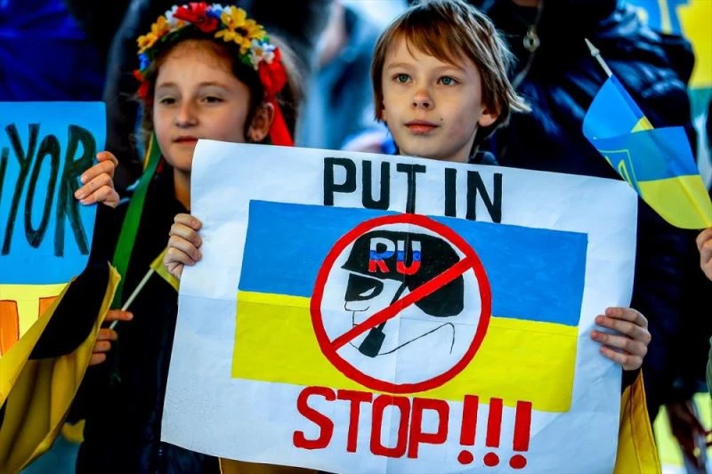 Cumhuriyet Meydanı'nda toplanan protestocular, Türk ve Ukrayna bayrakları ile "Savaşa hayır" yazılı pankartlar taşıdı.