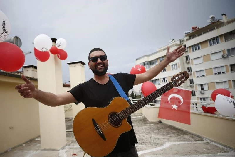 Muratpasa ilçesinde yasayan 40 yasindaki Nugay, yeni tip koronavirüs (Kovid-19) tedbirleri kapsaminda 23 Nisan Ulusal Egemenlik ve Çocuk Bayrami'nin bu yil tören alanlari ve meydanlarda kutlanamamasi nedeniyle komsulari için terasinda konser vermeye karar verdi.