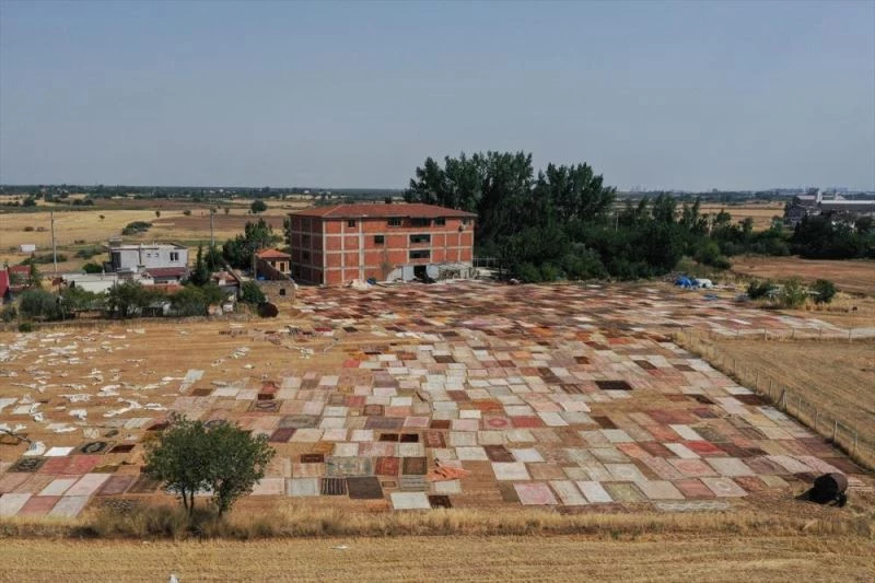 Dokuma tezgahlarında kök boyalı iplerle dokunmuş halı ve kilimler, Türkiye'nin 81 ilinden ilçeye getirilerek yıkanıp, kurutuluyor, onarımdan geçirildikten sonra tarlalara seriliyor.