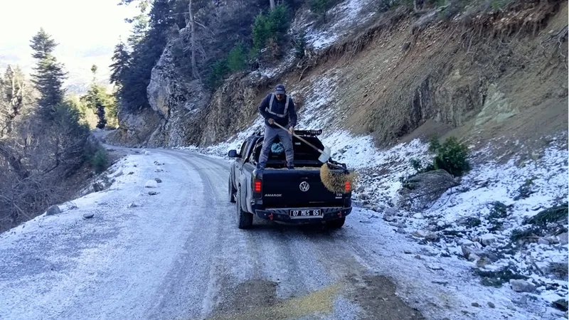 Ekipler, buzlanmanın etkili olduğu Alanya ve Gündoğmuş ilçelerinin yüksek kesimlerindeki grup yollarında tuzlama çalışması gerçekleştirdi.