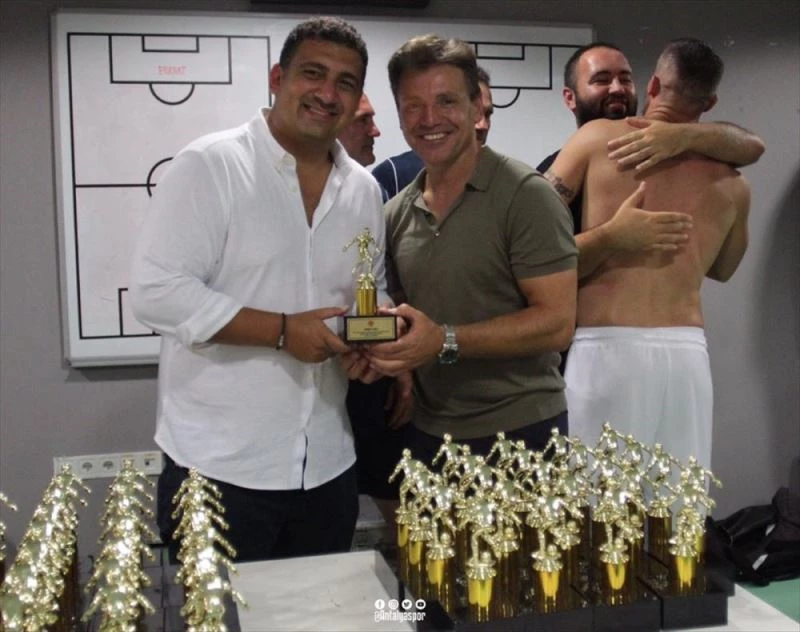 Antalyaspor Kulübü Baskani Ali Safak Öztürk, Antalya Stadi'nda oynanan Galatasaray karsilasmasindan sonra soyunma odasinda, kulüp tarihine geçen teknik ekip ve futbolculara, isimlerine özel yaptirilan ödülleri dagitti.