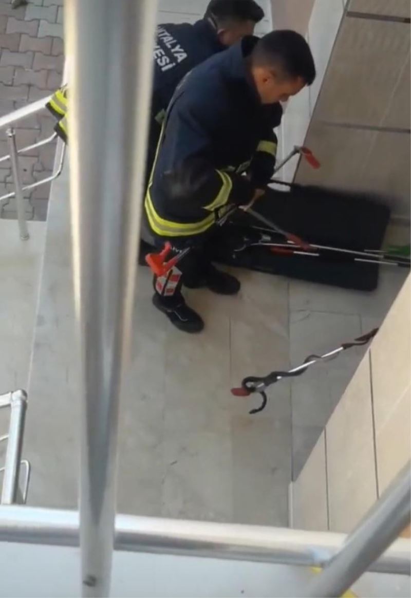 İtfaiye ekiplerini harekete geçiren olay, Ünsal Mahallesi’nde öğle saatlerinde meydana geldi. Edinilen bilgiye göre, bir dairenin kapısının önünde bulunan yılanı gören apartman sakinleri durumu 112 Acil çağrı Merkezine bildirdi. İhbar üzerine olay yerine Antalya Belediyesi İtfaiye Müdürlüğü ekipleri sevk edildi. Olay yerine ulaşan ekipler, kullandıkları özel aparatlarla, 1 buçuk metre uzunluğundaki yılanı apartmandan çıkardı.