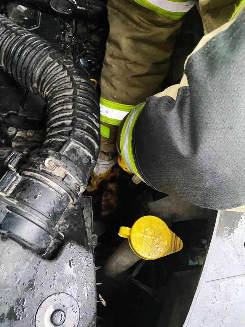 Araç motorunda mahsur kalan kediyi itfaiye kurtardı