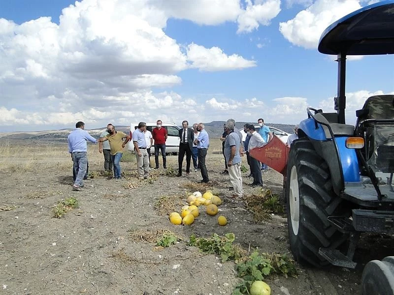 Tarım ve Orman İl Müdürlüğü tarafından hazırlanan "Nadas Alanlarında Çerezlik Kabak Yetiştiriciliği Projesi" kapsamında ekilen kabakların hasadı için yetkililer ve üreticiler tarlada bir araya geldi.