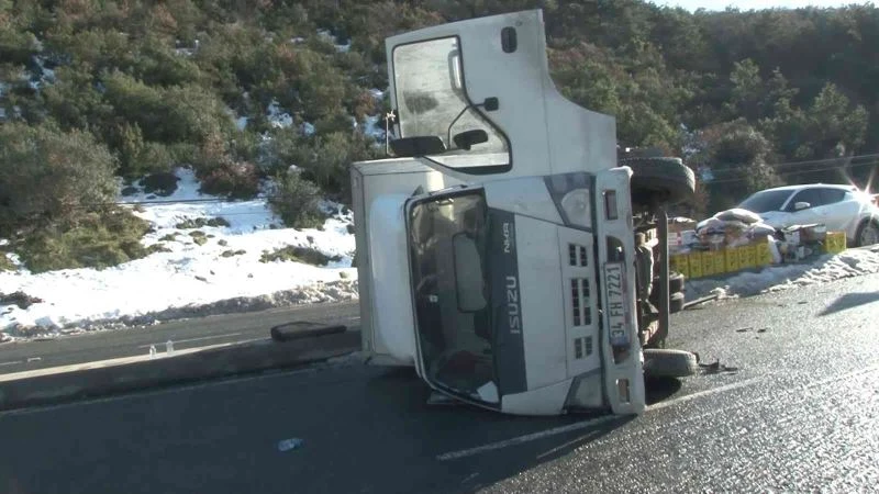 Arnavutköy’de buzlanan yolda sürücüsünün direksiyon hakimiyetini kaybettiği ileri sürülen kamyonet yan yattı. Yan yatan kamyonetin kasasında bulunan market malzemeleri yola saçılırken, sürücü ise yara almadan kurtuldu.