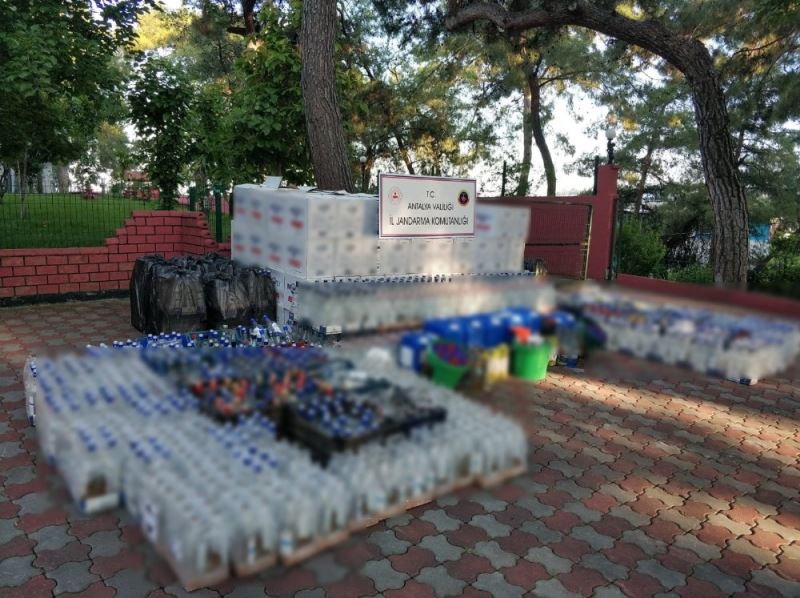 Antalya’da iş yerinin deposuna baskın düzenleyen Jandarma gördüklerine inanamadı. 1500 litre etil alkol ve şişelenmiş şekilde farklı sahte içki türleri ele geçirilen depodaki malzemelere el konuldu.