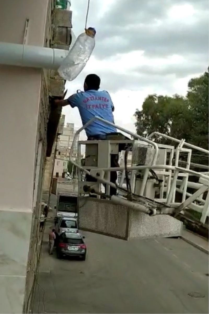 Nizip ilçesi Belkıs Mahallesi’ndeki Yeşil Camii yanında bulunan bir binanın çatısındaki tele, çevrede yiyecek ve su arayan bir kırlangıçın ayağı dolandı. Çatıdan aşağıya sarkan kırlangıç, uzun süre çırpınarak, telden kurtulmaya çalıştı. Hayvanın durumunu gören vatandaşlar ise itfaiye ekiplerinden yardım istedi.