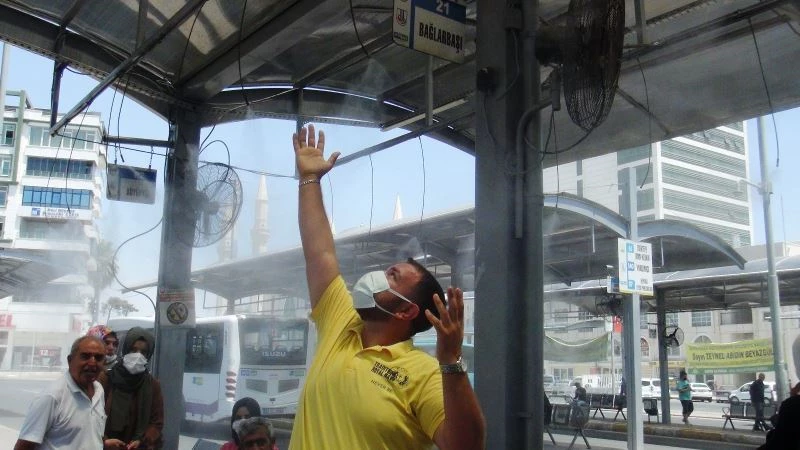 Şanlıurfa’da vatandaşlar, duraklara yerleştirilen buharlı serinletme sistemi ve vantilatörlerle serinliyor.