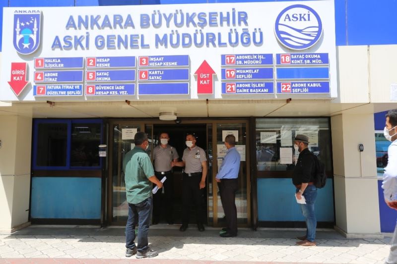 Toplum sağlığını önceleyen ASKİ, pandeminin yayılma riskine karşı abonelerin başvuru işlemlerini bina içine gruplar halinde alarak sırayla gerçekleştiriyor. Abonelik işlemleri için ASKİ’ye gelen vatandaşların ateş ölçümleri yapılırken, sık sık sosyal mesafe kuralı uyarılarında bulunuluyor. Ayrıca vatandaşların sıcak havadan korunması için ASKİ tarafından bina dışına bekleme çadırları kurulurken, sıra bekleyen vatandaşlara kolonya, su ve çay ikramında bulunuluyor.