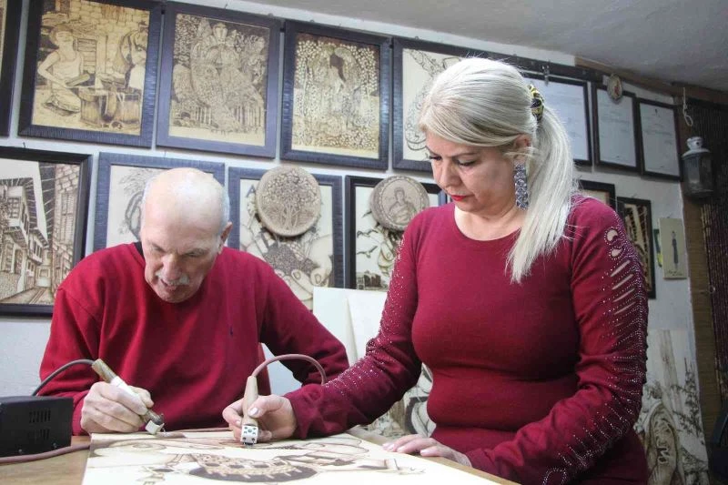 Hatay’da hobi olarak başladıkları yakma resim sanatı sayesinde tanışıp evlenen ve zamanla işlerinde ustalaşan Zeynep-Naim Gülbol çifti, eserlerinde hem aşklarını hem memleketlerini ahşabın üzerine milim milim işliyor.