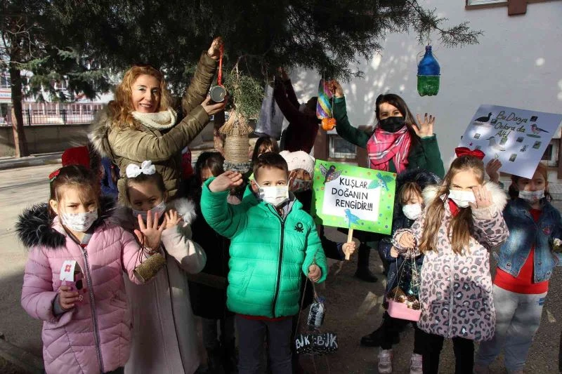 Amasya’da çocuklar kuşlara umut olmak için harekete geçip atık malzemelerden hazırladıkları kuş yuvalarını ve yemlikleri ağaçlara astı.