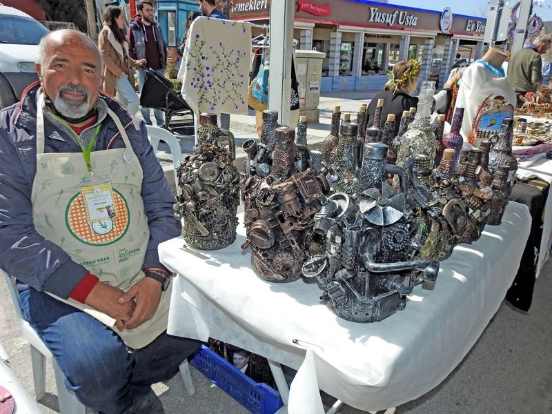 İzmir’in Çeşme ilçesinde yaşayan, üç yıl önce emekli olmasının ardından hobi olarak başladığı atıkları sanat eserine dönüştürme çalışmaları ile dikkat çeken Haldun Ozan, yaptığı eserlerle Alaçatı Ot Festivali’nde de ilgi gördü.