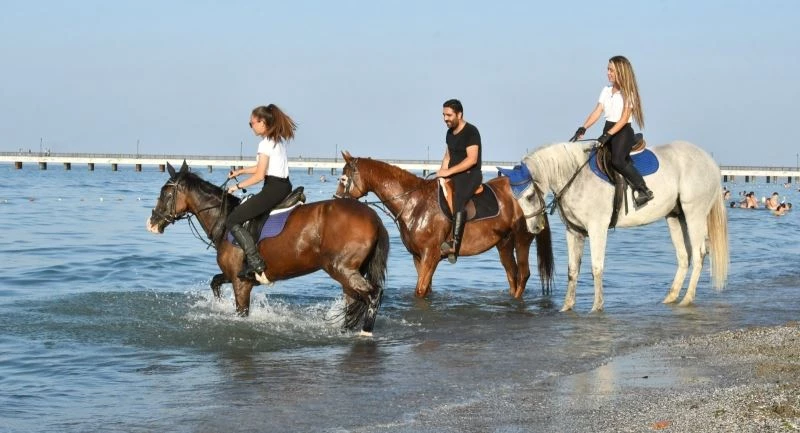 Atları stres atmaları için bu sezon ilk kez denize getirdiklerini belirten Büyükşehir Belediyesi Atlı Binicilik Spor Tesisleri Müdürü ve Antrenör Aydın Tekin, “Her yaz olduğu gibi bu sezon da atlarımızı denize soktuk. Deniz tuzlu olduğu için atlarımızın kaslarının esnemesinde, eklemlerinin güçlenmesinde ve tırnak yapısında büyük rol oynuyor. Atlarımızın özgüvenini yükseltiyor. Aynı zamanda sonbahardaki iyotlu hava atların solunum yapısına ve sinüzitlerine de iyi geliyor. Bunun yanında onların da stres atmaya ihtiyacı var. Çünkü ne kadar çok stres atarlarsa o kadar verim alıyoruz. Bu sebeple her sene denize getirmeye çalışıyoruz. Bunun yanında safari turlarına da çıkartıyoruz“ diye konuştu.