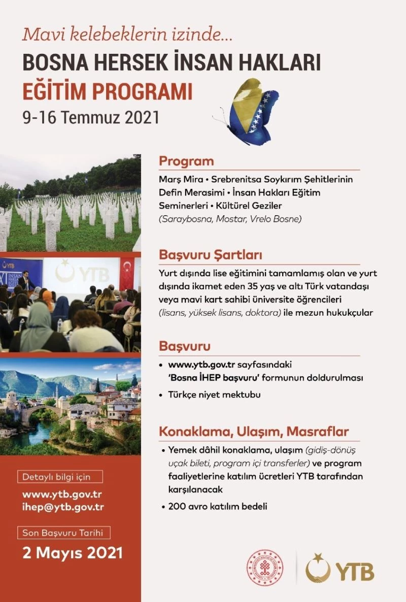 Yurtdışı Türkler ve Akraba Topluluklar Başkanlığı (YTB) tarafından Bosna-Hersek’te 9-16 Temmuz tarihleri arasında İnsan Hakları Eğitim Programı ve Srebrenitsa Soykırımı Anma Etkinlikleri düzenlenecek.