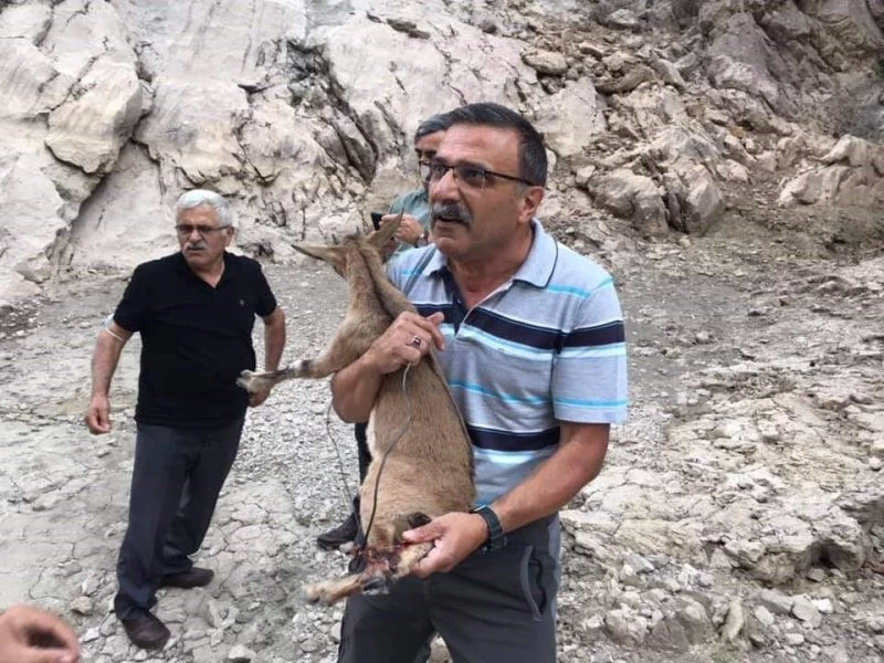 Erzincan’ın Kemaliye ilçesinde görevine yeni başlayan Kaymakam Emre Yeşilbaş ile beraberindeki heyet tekne turuna çıktılar. Karanlık kanyonda ayağına tel takılmış yavru bir dağ keçisi ile karşılaşıldı. Tur rehberi olan Şevket Gültekin, dağ keçisini yakalayıp, ayağındaki teli çıkararak tekrar doğaya saldı.