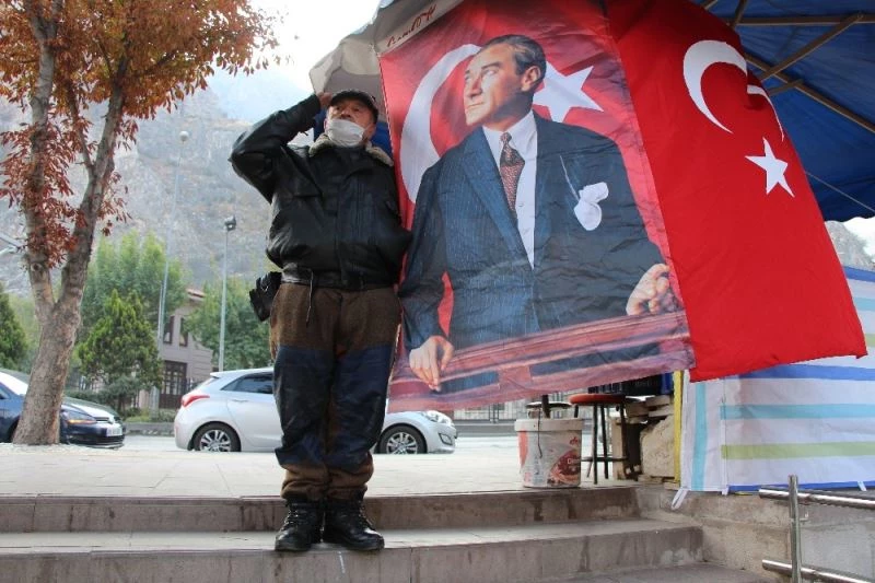Amasya’da yaşayan 72 yaşındaki ayakkabı boyacısı Yalçın Taşan, 10 Kasım töreni sırasında üstünü kaplayan şemsiyeye Türk bayrağı ve Atatürk posteri astığı sandığının önünde asker selamıyla gözyaşı içinde saygı duruşunda bulundu.