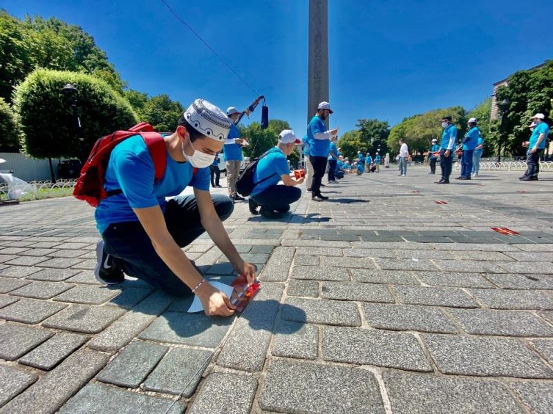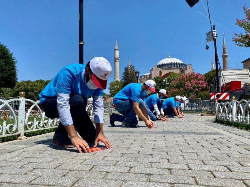 Ayasofya çevresinde Cuma namazı için sosyal mesafe stickersları yapıştırıldı