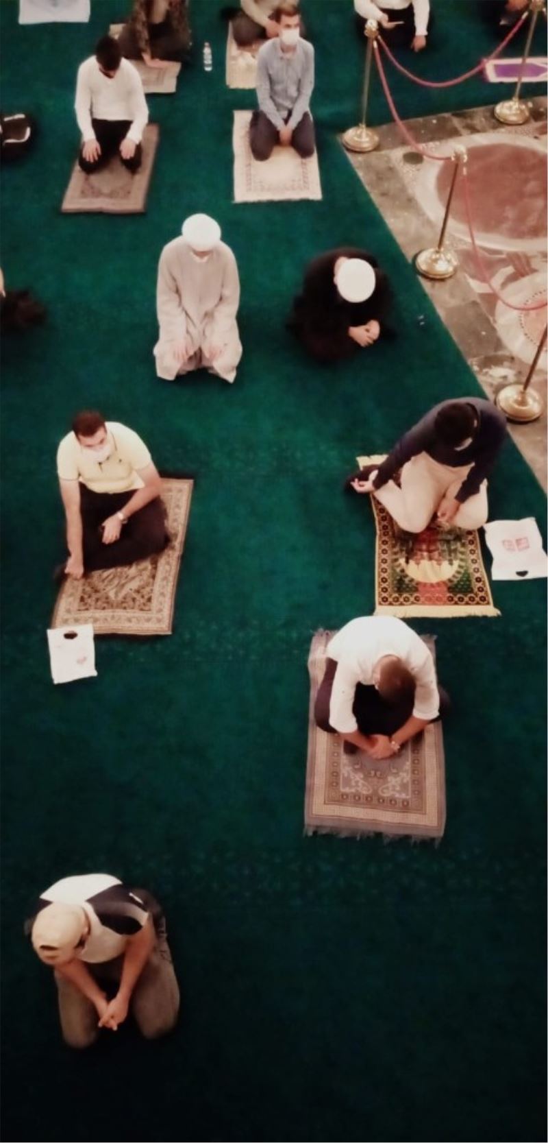Kalabalık daha sonra ellerindeki seccadelerle saf tuttu. Sosyal mesafe kuralına uymayarak saf tutanları ise, Diyanet İşleri Başkanlığına ait görevlilerce, sosyal mesafeye uyulması için tek tek uyarıldı. Namaz öncesi Kur’an-ı Kerim okunurken, cemaatin okunan dua ve Kur’an’a eşlik ettiği görüldü.