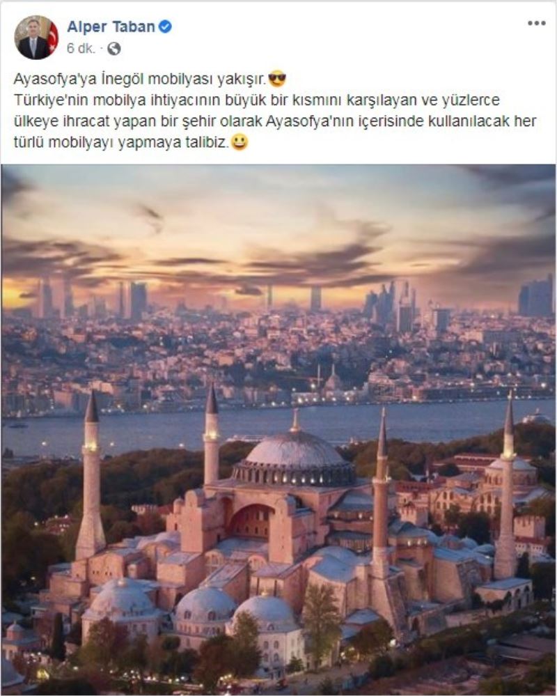 Türkiye’nin mobilya başkenti İnegöl ilçesinin Belediye Başkanı Alper Taban, "Dün tarihî bir gün yaşadık. Ayasofya’nın müzeden camiye dönüştürmesi bizleri çok mutlu etti. Bu mutluluğa bizleri ulaştıran Cumhurbaşkanımıza teşekkürlerimizi iletiyoruz. Kararın ardından dün biz de bazı paylaşımlarda bulunduk. Özellikle bu mutluluğa ortak olabilmek için Aysofya’nın içerisinde yer alan ağaç ahşap dekorasyonla alakalı mobilya işlerine talip olduğumuzu ilettik. Bunlar neler olabilir? Mihrabından minberine ve müezzin mahfillerine kadar her türlü ağaç ve dekorasyon işlerine talip olduğumuzu ve bundan büyük mutluluk duyacağımızı söylemek istiyorum. Gündem daha çok sıcak, bununla ilgili talebimizi gereken yerlere ileteceğiz, ama önce sosyal medyadan sayın Cumhurbaşkanımıza iletmek istedik" dedi.