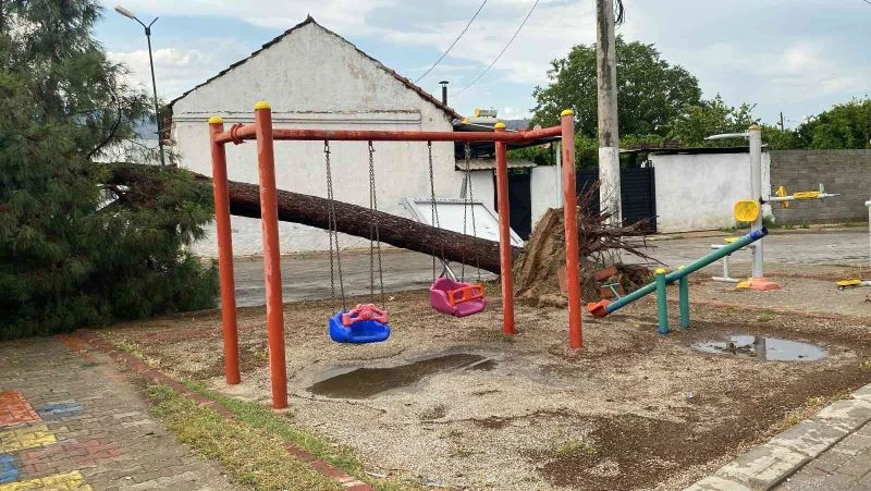 Aydın’ın birçok ilçesinde yaklaşık 1 haftadır etkili olan sağanak yağış etkisini göstermeye devam ediyor. Son olarak Efeler ilçesi Kocagür Mahallesi’nde akşam saatlerinde bir anda başlayan ve kısa sürede etkili olan sağanak yağış ve şiddetli rüzgar, mahalledeki birçok ağacı devirirken hayatı olumsuz etkiledi. Mahalle meydanında bulunan çocuk oyun parkındaki çam ağacı da şiddetli rüzgardan nasibini aldı. Park içerisinde bulunan yaklaşık 10 metrelik çam ağacı, rüzgarın etkisiyle devrildi. Olay esnasında parkın boş olması facianın önüne geçerken, olayda can kaybı ve yaralananın olmaması teselli kaynağı oldu.