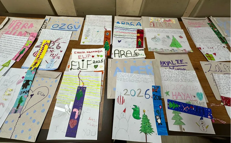 Aydın Gençlik ve Spor İl Müdürlüğüne bağlı Aydın Gençlik Merkezi'nde resim eğitimi alan öğrenciler, Kızılay Yaşam Merkezi Konteyner Kent Genç Ofis'teki çocuklara yılbaşı tebrik kartları, mektuplar ve küçük hediyeler gönderdi.
