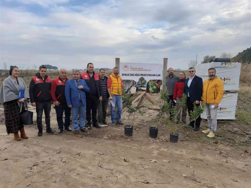 Ayvalık Sakız Ağacı Projesi alanında gerçekleştirilen fidan dikimi etkinliğinde; Ayvalık Kaymakamı Hasan Yaman, Balıkesir İl Tarım Müdürü Erkan Alkan, Ayvalık İlçe Tarım Müdürü Volkan Oral, Ayvalık Orman Şefi Deniz Meltem, Bursa Teknik Üniversitesi Orman Fakültesi Öğretim Görevlisi Doç. Dr. Salih Parlak, Mutluköy Mahalle Muhtarı Erdinç Tügen ve teknik personeller hazır bulundu.