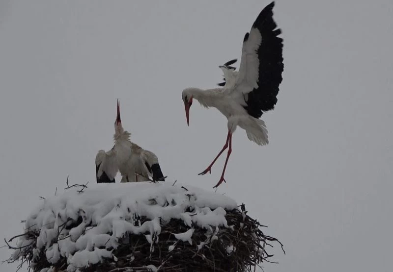 Baharın müjdecisi leylekler yuvalarında kara yakalandı