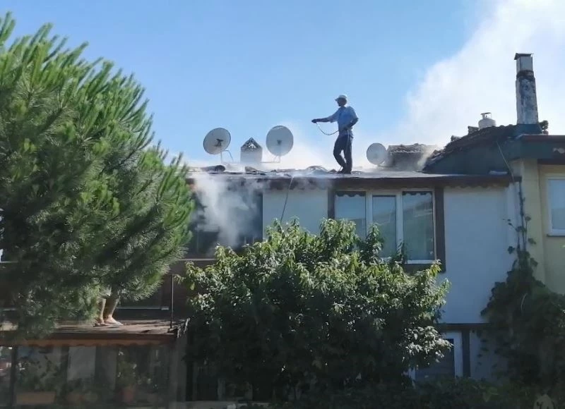 Bahçe hortumu ile çatıya çıkıp yangını söndürmeye çalıştı