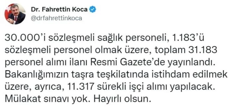 Sağlık Bakanı Fahrettin Koca, sosyal medya hesabından, 30 bini sözleşmeli sağlık personeli, bin 183’ü sözleşmeli personel olmak üzere toplam 31 bin 183 personel alımı ilanının Resmi Gazete’de yayımlandığını duyurdu. Ayrıca, Sağlık Bakanlığının taşra teşkilatlarına da 11 bin 317 sürekli yapılacağını belirten Bakan Koca, “Bakanlığımızın taşra teşkilatında istihdam edilmek üzere, ayrıca 11 bin 317 sürekli işçi alımı yapılacak. Mülakat sınavı yok. Hayırlı olsun” ifadelerine yer verdi.