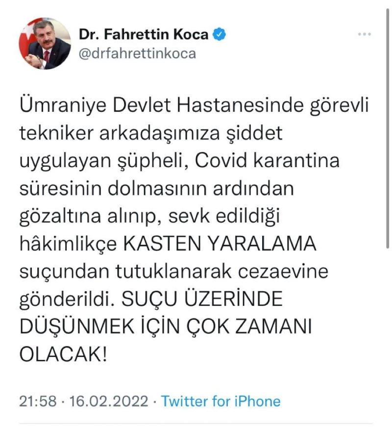 “Ümraniye Devlet Hastanesi’nde görevli tekniker arkadaşımıza şiddet uygulayan şüpheli, Covid karantina süresinin dolmasının ardından gözaltına alınıp, sevk edildiği hâkimlikçe kasten yaralama suçundan tutuklanarak cezaevine gönderildi. Suçu üzerinde düşünmek için çok zamanı olacak!”