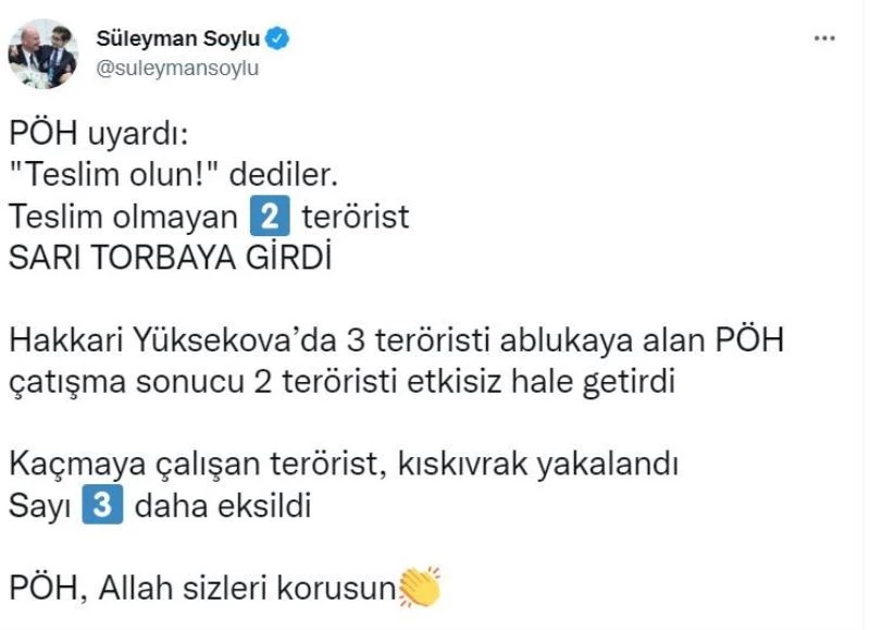 Konuyla ilgili sosyal medya hesabından paylaşımda bulunan Bakan Soylu, “PÖH uyardı: ‘Teslim olun’ dediler. Teslim olmayan 2 terörist sarı torbaya girdi. Hakkari Yüksekova’da 3 teröristi ablukaya alan PÖH çatışma sonucu 2 teröristi etkisiz hale getirdi. Kaçmaya çalışan terörist, kıskıvrak yakalandı, sayı 3 daha eksildi. PÖH, Allah sizleri korusun” ifadelerine yer verdi.